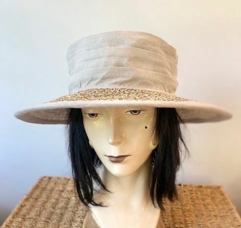 A bestseller at Lynsey Champion Hats! Linen Cotton hat with seagrass straw brim. The brim is lined with linen/cotton for added sun protection. Packs flat for travel.