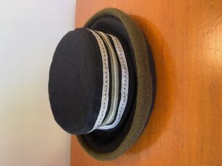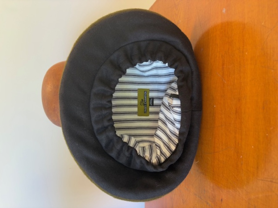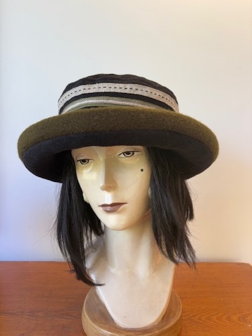 100% NZ Made wool coating hat with green wool brim trim. Stripes of braid on the crown. This hat has adjustable elastic in the crown so fits 55-60cm. It is a one of a kind.