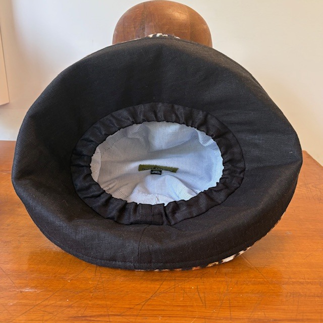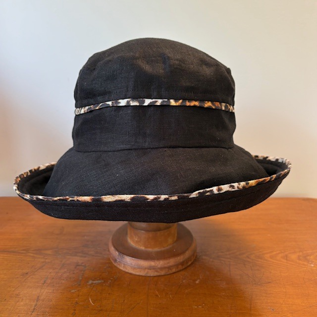 Linen hat with great sun protection. Great for travel, elastic inside for comfort and fit. Stylish and practical. This is a multi-size - fits 55-59.5cm This one is Black with Animal Print trim. Email me if you would like another colourway