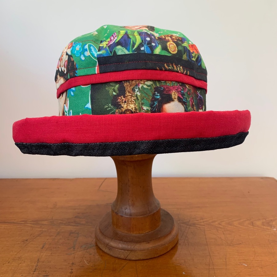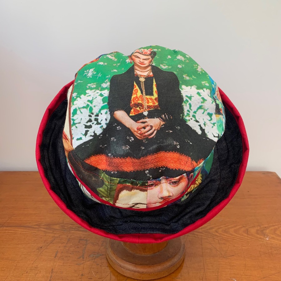 Fabulous Frida Kahlo light denim, linen and 100% cotton hat. It has elastic inside which is adjustable - fits 55.5-60cm. The brim has boning in the rim.