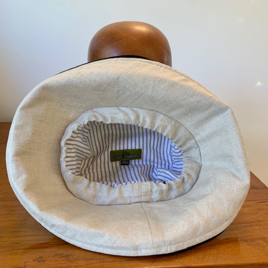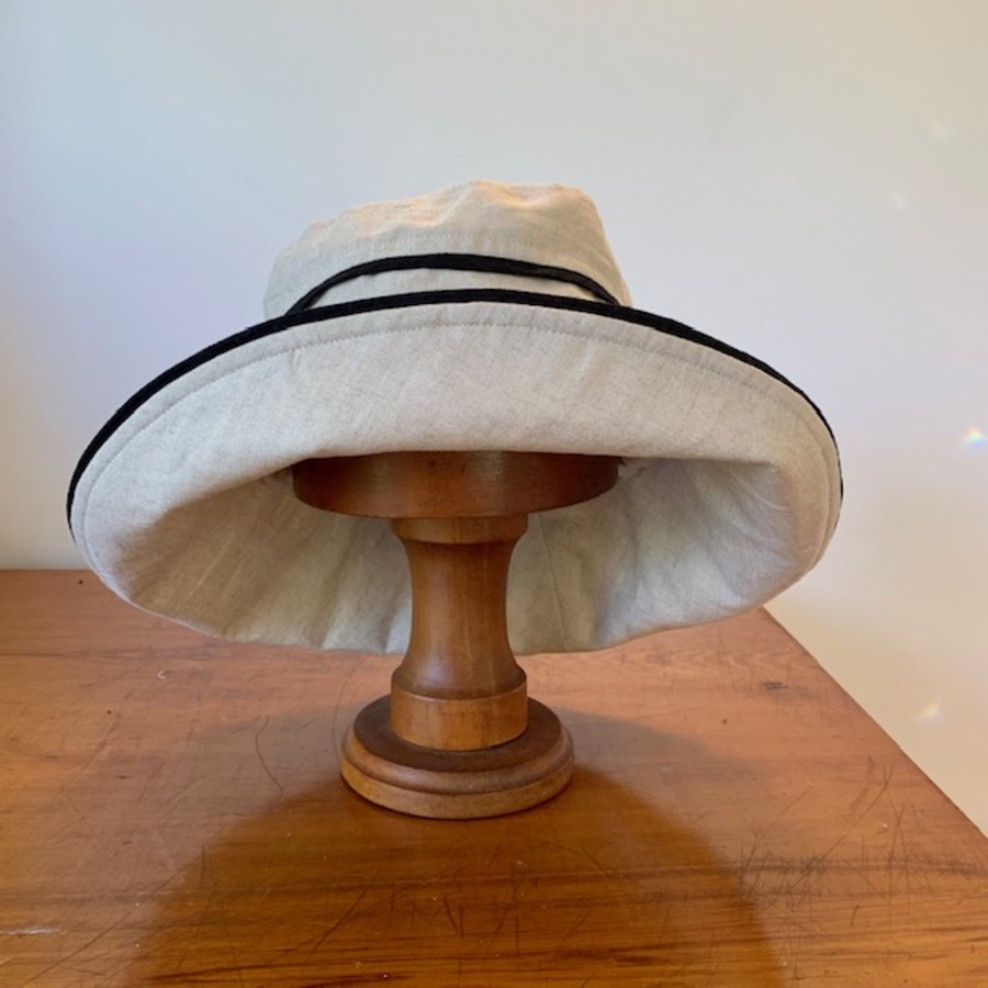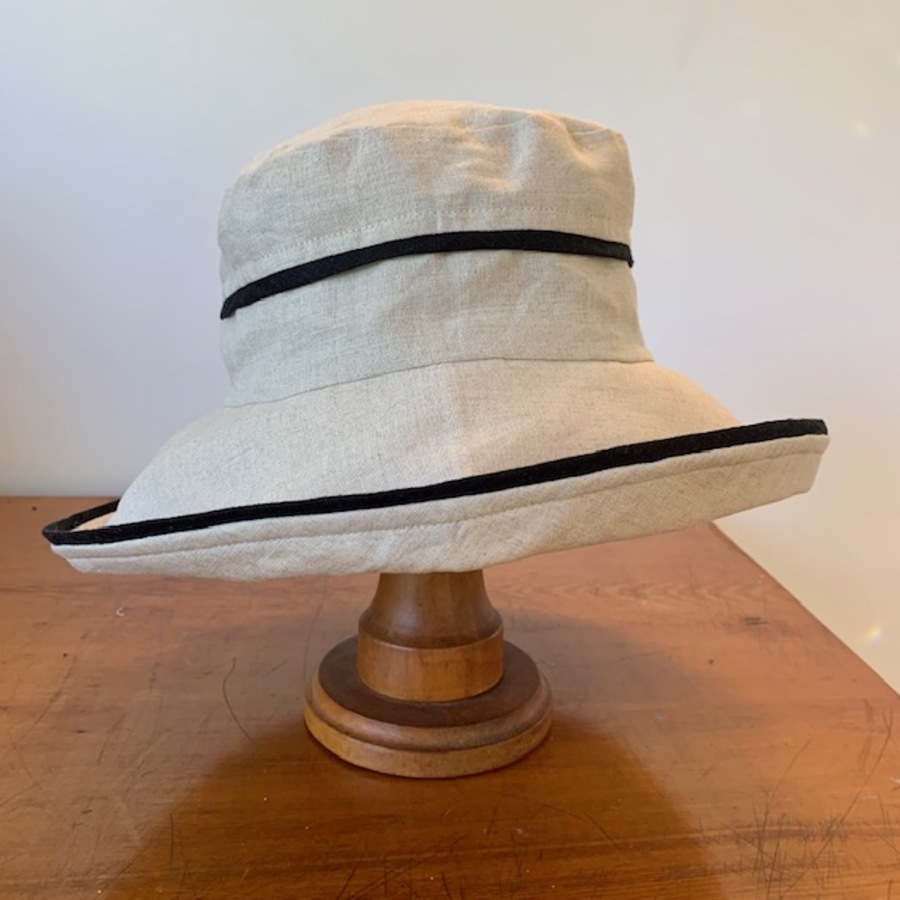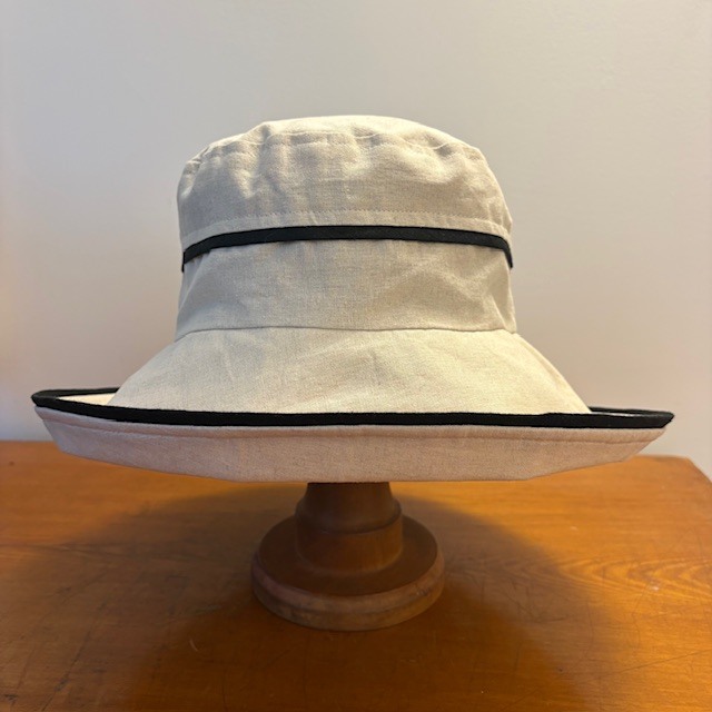 Linen hat with great sun protection. Great for travel, elastic inside for comfort and fit. Stylish and practical. This is a multi-size - fits 55-59.5cm This one is Oatmeal with Black trim. Email me if you would like another colourway